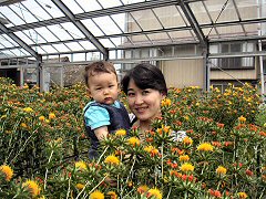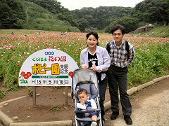 「久里浜花の国」にポピーを見に行きました。曇り空だったけどちょうどいい気温だったね。パパとママはサンドイッチ、ぼくは離乳食をもっていって、ポピーを見ながら食べました。花の国はとっても広かったけど、パパとママはぼくのベビーカーを押してたくさん歩いたよ。芝生の広場ではたっちの練習やハイハイをしました。帰りは疲れて電車の中でみんなで寝ちゃったね。楽しかったね