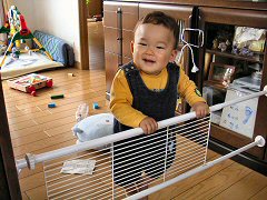 夕方近所の公園に行ったらコウスケくんに会ったよ。コウスケくんは元気に歩き回っていたね。いいなぁ。ぼくも早く歩けるようになりたい!帰ったら特訓だっ!ママは台所の入口に突っ張り棚でバリケードを作ったよ。ぼくがイタズラしないようにって。ぼくはそのバリケードでたっちの練習ができるね。でも体重をかけるとはずれちゃうよ。良い案だと思うんだけど、いまいちかな。
