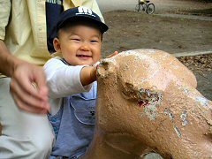 今日は日曜日。パパとママと3人で公園に遊びに遊びに行きました。公園にはらくださんやかばさんやぞうさんがいるんだよ。左の写真はらくださん。年季がはいっていてエジプトのスフィンクスみたいでしょ。パパもぼくみたいに小さかったときもこうやって遊んだんだよ。