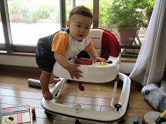 今日はとってもいい天気。洗濯日和だって、ママは張りきって洗濯をしたよ。ぼくはこないだ習得した歩行器登りの練習をしました。こうやって、こうして、こうするんだよ。