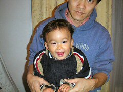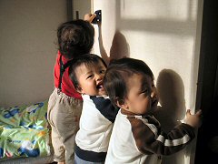 だいぶ言葉を理解できるようになりました。「〜はどれ?」と聞くと正確にそのものをポイントします。覚えた単語は、パパ、ママ、目、鼻、口、耳、手、足、おなか、頭、スプーン、フォーク、スリッパ、電車、テレビ(ビデオと同じだと思っている)、たまご、ハム、レタス、キュウリ、…。口に入れたものを「どれ?」と聞くと自分の口を指します。話す努力もしているようですが何を言っているのかわかりません。ときどきパパ、ママ、じぇーじゃ(電車)と言っているみたいです。ママの手を取って外に誘ったり、テレビの画面を指してビデオを見せろと要求したりします。 1歳6か月/ 1歳7か月/ 1歳8か月