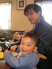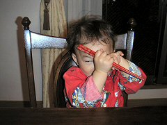 食事のとき、ママはスプーンやフォークをくれるんだけど、大人のまねが好きなぼくはお箸を使いたいんだ。やっぱり日本人はこれだよね 特に赤いお箸が好きなんだ。すぐママのお箸を取り上げちゃうんだよ。ぼくは強情だから、ママはあきらめてほかのお箸を使う羽目に。ごめんね。えーい、変身だぁ!(使い方間違ってるよ。ちょっと目が怖いし。)
