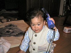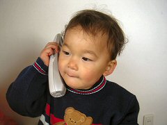 ぼくは電話が大好き。格好はキマっているんだけど、ぼくはまだほとんど話せないから無言電話になっちゃうんだよね。電話の向こうから「悠くーん」と呼ばれて「んー」と返事するのが精一杯。とりあえず「もしもし」くらいは言えるようになるといいな。