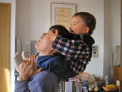 今日はパパと肩車をして遊んだよ。パパは肩車すると体を後ろにそらすんだ。ぼくは落っこちそうになって手でパパの顔を押さえるんだよ。パパはおもしろそうにやるけどぼくは必死なんだから。ちょっとスリルがあっておもしろいけどね。腹筋と背筋が痛くなっちゃったよ。