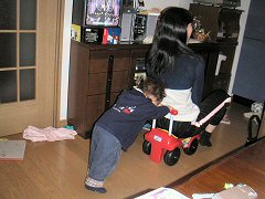 ぼくの大好きなクルマにママが乗ったよ。ぼくはママを乗せてクルマを押すんだ。重いな〜。