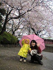 今日はお花見に行ったよ。桜がせっかく満開になったのに今日はあいにくの雨。それにとっても寒い ぼくは黄色いレインコートを着て、パパとママと近所の孝道山に行ったよ。いやあきれいだねぇ。