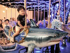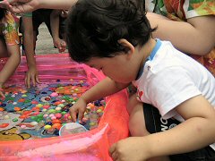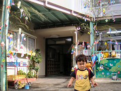 すぐにマリンパークに着いて、サメやカニやカメやペンギンやおっきい魚や小さい魚がいっぱいいたよ。お昼はお友だちの家族と一緒にお弁当を食べたね。ぼくはお弁当箱を運ぼうとしてポテトサラダをひっくり返して叱られちゃった。ごはんのあとはいるかのショーを見たよ。泳ぎが上手だね 今日は会社のイベントにパパとママと参加したよ。十国峠ってところに行ったんだ。ママが運転したよ。途中小田原駅で和田一家と一緒に。まなみちゃんかわいかったね。十国峠ではケーブルカーに乗って山に登って、お弁当を食べて、ボールで遊んだね。ぼくもまなみちゃんもボールを持ってきたけど、交換して遊んだよ。お兄ちゃん達も別のボールで遊んでいたね。それからお兄ちゃん達は歩いて、僕たちとまなみちゃんたちはケーブルカーで山を下りて、山の下でまた合流。今日はお泊まりだよ!露天風呂気持ちよかったねぇ。 今日は淡島マリンパークに行ったよ。あれ、またマリンパークだね。淡島へはロープウェイか船で行くんだよ。ぼくはベビーカーがあるから船に乗ったんだよね。どっちに乗ってもゆらゆらだね。船を下りたらいるかのショーを見たよ。あれ、パパまた居眠り…ほらみてごらんー 今日はパパとママの結婚記念日だよ。The 4th annivarsary なんだよ。のーちゃんがたくさんのお料理とケーキを用意してくれたよ。おなかいっぱいになった頃、横浜港の開港祭の花火があがって、みんなで屋上に上って花火を見たね。昨日も花火だったね。ぼくは「たまや〜」って言ったよ。今日はママはテニスの練習会に行ったよ。ぼくはパパとお留守番。パパと近所の公園に行ったよ。僕は三輪車、パパは押す係。公園に着いたら砂場で遊んだよ。道具をあちこちに散らかして、目が良くないパパを困らせたよ。でも遊んでいたらひーちゃんが来て道具を全部集めてくれたよ。天気が良かったから少し日焼けしちゃった。おうちに帰ったら疲れてぐっすりお昼寝。おねしょしちゃったよ。 おとといは父の日だったよ。先週保育園で父の日の創作をしたんだ。色画用紙にお花と丸が貼ってあって、ぼくは茎に葉っぱをつけて丸の中に顔を書き込んだんだよ。今日は保育園からそれを持ち帰ってパパにあげたんだよ。パパ、帰りが遅くて直接渡すことはできなかったけど、とっても喜んでくれたんだって。 今日はママの誕生日だよ。おめでとーいくつものー日々をーこえて〜♪ 今日は久しぶりにおーちゃんのおうちに行ったよ。道路が混んでいてたくさんクルマに乗れた。おーちゃんのうちではまたプラレールで遊んだよ。電池で動かすより手で動かす方が醍醐味を感じるね。なんかおーちゃんのうちの電池はどれもパワーがないような気が…。そのあと焼き肉を食べに行ったよ。僕は白いごはんと韓国海苔ばかり食べてた。焼き肉屋さんに行く意味なかった。でもみんなはたくさんお肉を食べたよ。 今日はクルマでホームセンターに行ったよ。じょうろと植木鉢と日々草を買ったね。ぼくはずっとじょうろを運んでいたよ。おうちに帰って、パパが日々草を植えたよ。お庭の手入れはいつもぼくがお手伝いするんだよ。 今日はスタン&テレサからぼくの誕生日のプレゼントが届いたよ。毎年送ってくれてうれしいね。二人はママが学生時代にホームステイ先でお世話になったご夫婦だよ。今年のプレゼントはぼくの大好きな本。"My first ABC" っていう英語の本だよ。なぜかママにもSosekiの"Kokoro"って本が。これも英語。それに英語のお手紙が添えてあったね。Thank you very much for my birthday presents, Stan and Theresa. I'm pleased with them!! なんだな。 今日は七夕。保育園の竹にみんなの短冊がぶら下がっているね。ぼくのもあるよ。こないだの日曜日にパパやママと一緒に書いた短冊だよ。ぼくは、んーと何を書いたんだっけ。パパやママもお願い事を書いたんだよ。保育園から帰ったらみーちゃんと峻ちゃんが来ていたよ。やあ久しぶり! みんなで近所のお豆腐のお料理屋さんに行ったよ。パパも少し遅れて登場。峻ちゃんはよく食べるねぇ。ぼくは峻ちゃんと遊びたくて落ち着かなかったよ〜。 今日はママと二人でお出かけだよ。ママのお友だちに会いに品川に行ったんだ。みんな一緒に会社に就職したんだって。みんなでお話ししたあとはアミューズメントパークに行ったよ。海の動物のメリーゴーラウンドでぼくはサメに乗ったんだ。こわいねー。帰ったらまた峻ちゃんと遊んだよ。今日はママの思いつきで写真屋さんに行ったよ。ぼくが三輪車と一緒の写真を撮ったんだよ。でもなんか落ち着かなくて、パパやママや写真屋さんのおじさんやおばさんがみんなでぼくを笑わせようとするんだけど、なかなかうまくいかないんだ。ちゃんと撮れたかなぁ。できあがりが楽しみだね。みーちゃんと峻ちゃんは今日帰ったよ。寂しくなるね。ばいばい。 今日は午後から保育祭り。保育園のお庭やお部屋の中でいろんな遊びをしたよ。ヨーヨーすくいにス