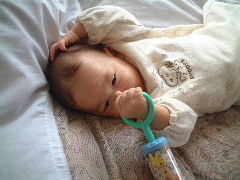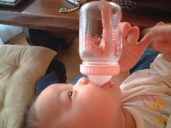 3か月のお祝いにジュースをもらいました。哺乳瓶で10mlだけ飲んだよ。ジュースは水で薄めてあるんだ。泣く前に「ふぇ〜ん」と "泣くよサイン" で意思表示します。
