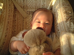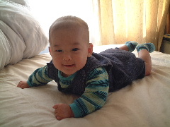 パパはまだぐったりしてます。しつこい風邪だって言ってます。ぼくは少し調子がいいので、お布団の上でじたばたしていたら、なんと寝返りに成功したよ!体重の移動が難しいんだ。もっと練習してたくさん寝返りできるようになるぞ!この要領を忘れないように…。ママは最近インターネットでオークションをしているみたい。なんか今日初めて落札したんだって。何を落札したのかなぁ。
