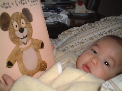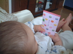 ママとSATYにお買い物に行きました。でもぼくはベビーカーの中でずっと寝ていました。初めていちごのジュースを飲ませてもらいました。おいしかったよ!律子さんからクリスマスカードが届いたよ。パパとママからクリスマスプレゼントに絵本をもらいました。まだ読めないけどね。