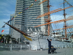 桜木町にある日本丸に乗りにいきました(日本丸メモリアルパーク)。 船に乗ったのは初めてだよ。かっこよかったな。甲板や操舵室や船室を見たよ。大きくなったら船乗りさんになろうかな〜。そのあと船の博物館(マリタイムミュージアム)に行って、船の模型やビデオを見ました。それからワールドポーターズに行って帰りました。ママはとっても楽しかったって言ってたよ。