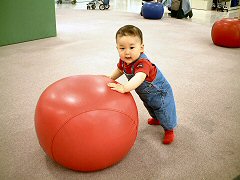 今日はプレイルームに行ったよ。毎週火曜日に近所の地区センターでやっていて、お友達もたくさん来るんだよ。いろんなおもちゃがあってとっても楽しいんだよ!それからママのお洗濯のお手伝いもするんだよ。かごから洗濯物をつかむとママがそれをキャッチするんだ。ぼくはまだ「はいっ」って渡せないからママが取り上げるみたいに見えちゃうけど、これでもちゃんと手伝っているんだよ。カタカタの練習を応用して洗濯かごを押すことだってできるんだから!