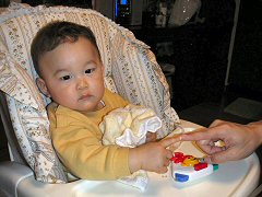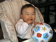 ママのお友達の真季ちゃんが遊びに来たよ。最初はちょっと泣いちゃったけど、そのうち仲良しになってたくさん遊んでもらったよ。楽しかったよ。今日もおーちゃんがマナガツオやお菓子のデリバリをしにおうちに来てくれたよ。それからぼくは「いないいないばー」を覚えたよ。タオルで顔を隠して、ママの声にあわせて顔を出すんだ。難しい芸をマスターしたでしょ!
