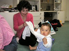 明日は母の日。今日はあーちゃんへのプレゼントを持って町田のおーちゃんとあーちゃんのおうちに行ったよ。最初は少し恐くてべそかいたけど、すぐご機嫌になったね。前は町田のおうちに行くとずーっと泣いていたけど、おーちゃんとあーちゃんと一緒に遊べるようになって、パパやママが良い子だねって褒めてくれたよ。おーちゃんも大喜びでした。